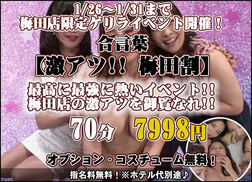最高に最強に熱いイベント!!梅田店の激アツを御覧なれ!!70分 7998円オプション・コスチューム無料!指名料無料!※ホテル別途1500円~!ギン妻パラダイス梅田店場所:大阪府大阪市北区兎我野町11-20新大同ビル701号室TELL:06-6130-0050